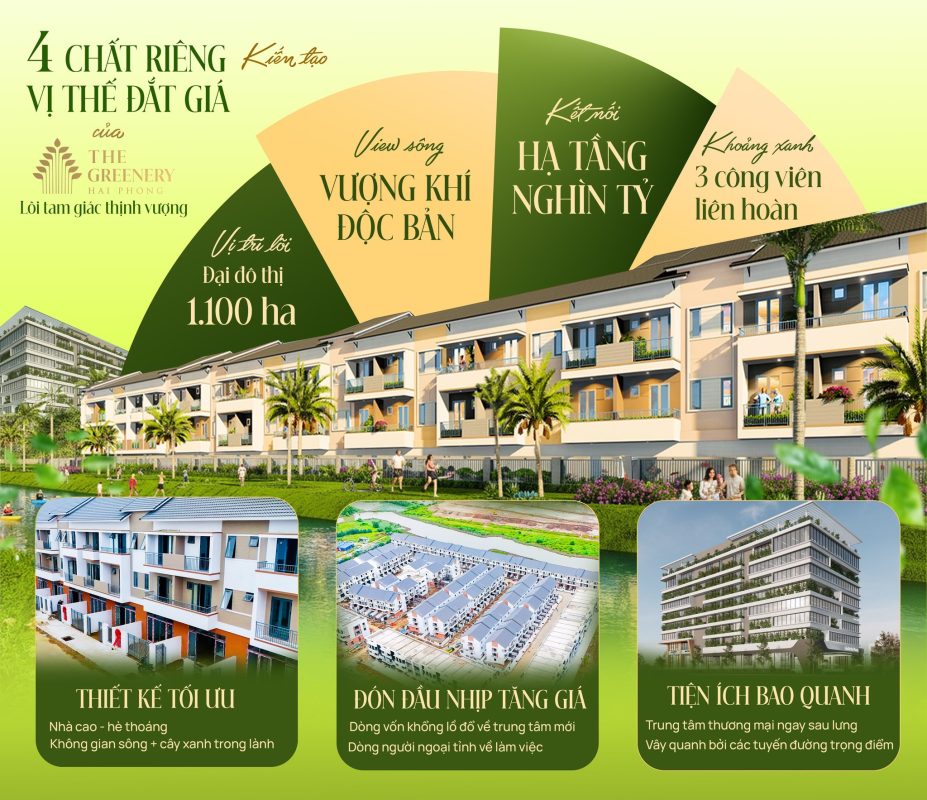Từ The Greenery, chỉ vài phút là đến trung tâm hành chính, đảo Vũ Yên và các khu đô thị trọng điểm. Tam giác thịnh vượng này tạo nên thế phong thủy vững chắc – cận thị, cận giang, cận lộ – biểu trưng cho tài lộc và phát triển bền vững.